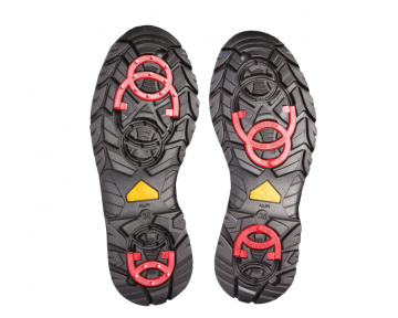 .OC System 雪地防滑鞋底系統,可收合之不鏽鋼冰爪藏在鞋底凹槽之中,翻出時能抓穩冰面以防止滑倒。在平滑地面可收摺回。