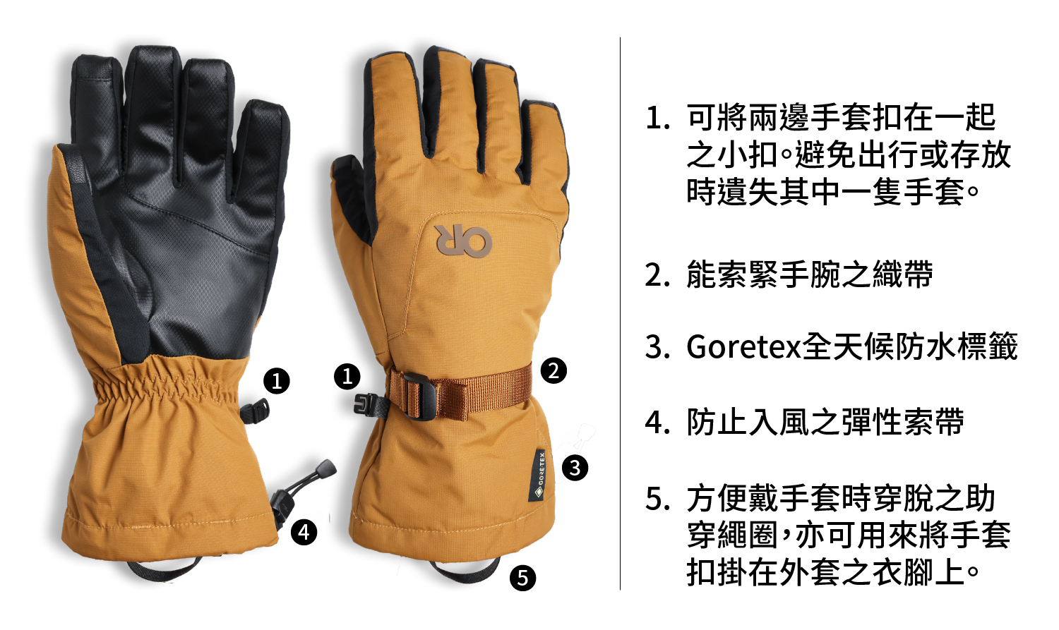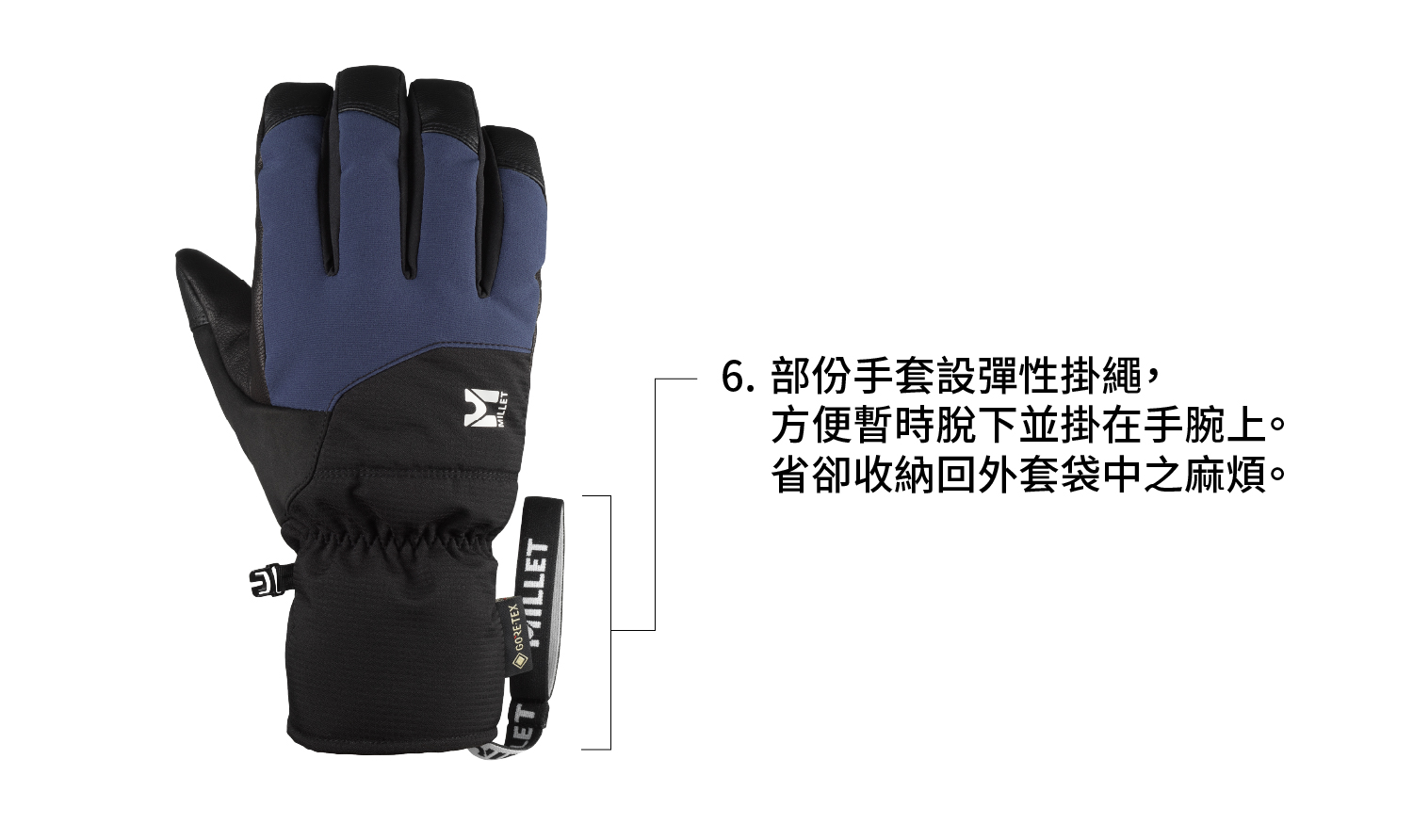 選購雪地手套時,可留意部份款式的手腕位置設計較長,能覆蓋更多前臂的袖口位。這些長款雪地手套通常會於手腕設有織帶,近開口處再設彈性索帶。