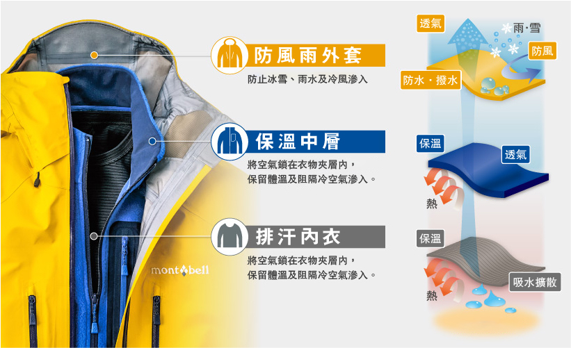 「三層式穿衣法」讓你同時擁有排汗透氣、防風保溫等功能,面對任何環境亦安全舒適。