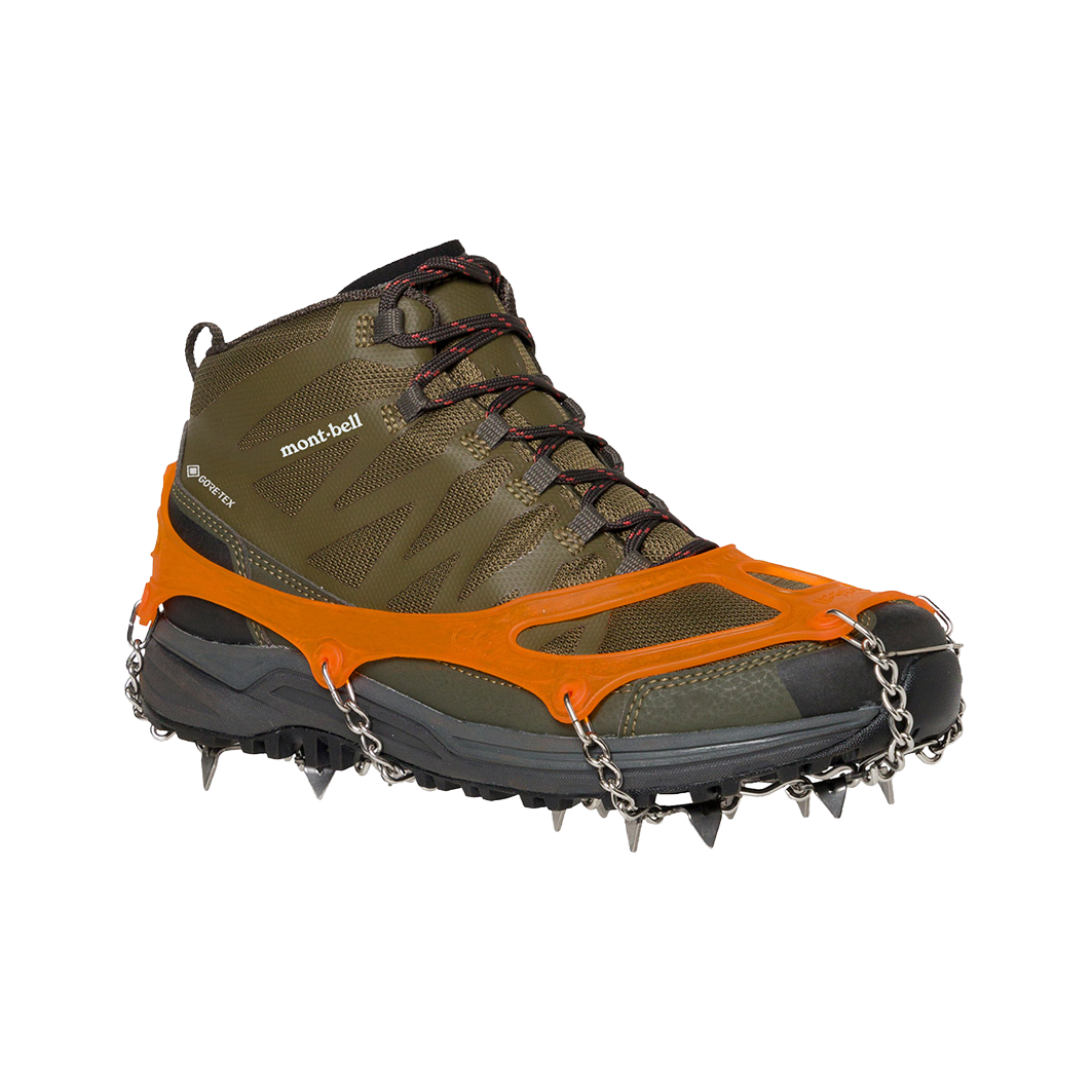 輕便冰爪,可以輕鬆套在鞋子外面。讓你可平穩地在雪地行走探索。附收納袋。