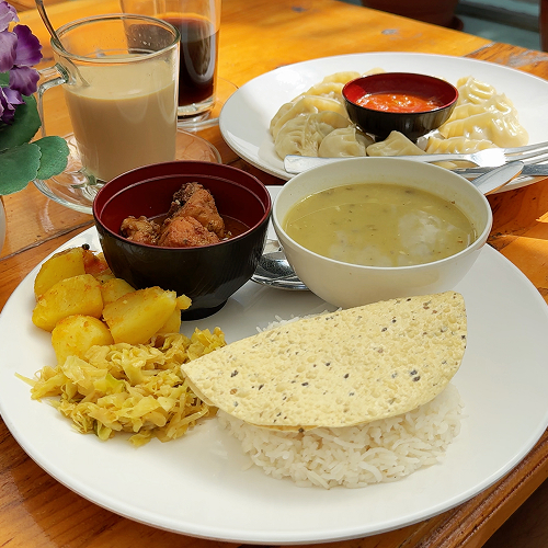 每間餐廳的餐牌大至相同,主食靈魂為Dal Bhat(豆湯飯)——米飯配上扁豆湯、咖哩蔬菜,常附醃菜,營養均衡且「通常可免費續加」。另外推薦湯麵、炒麵、意粉、MOMO餃子,以及檸檬薑茶。