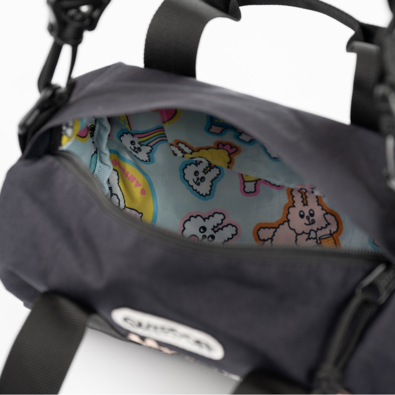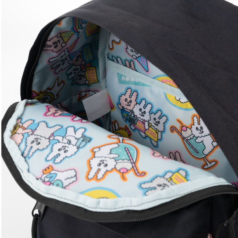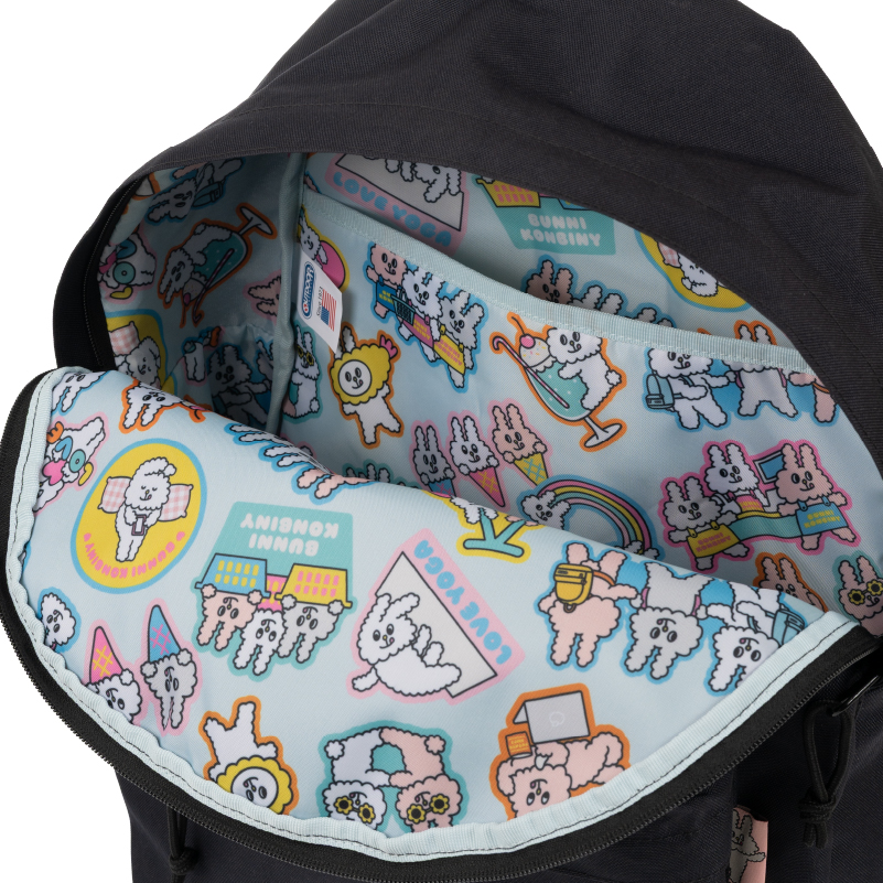 以 Outdoor Products 452U 經典背囊為原型,3位主角就像從背囊中探頭出來同大家見面。內裡充滿繽紛之 Bunni 日常生活及食物圖案,讓你盛載著歡樂的心情出門。背囊更附送 Mayo 頭像啪鈕掛飾,可隨意扣在不同位置。