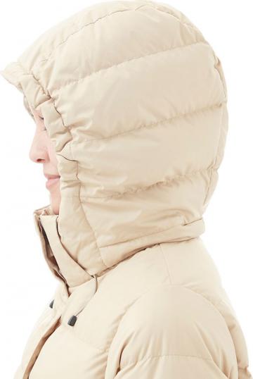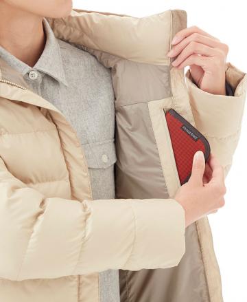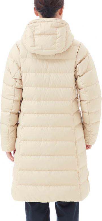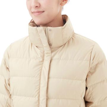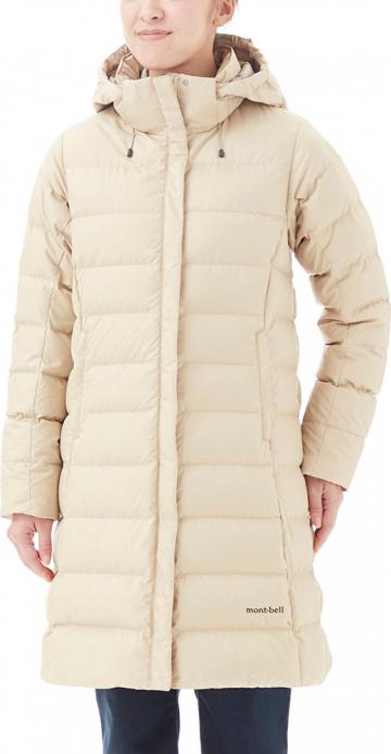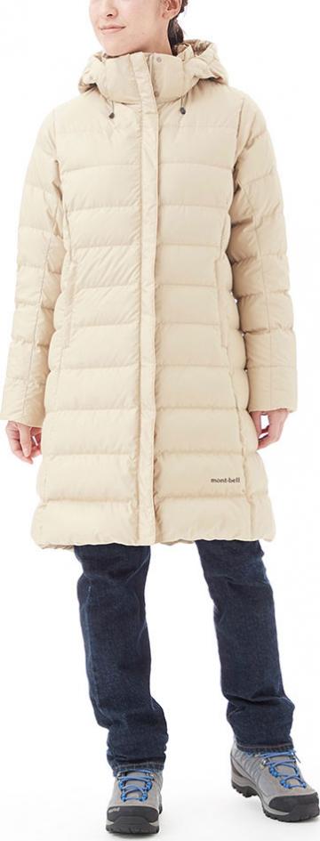 mont-bell專為旅遊人士而設之輕便羽絨女裝大衣,及膝長度確保有充足之保暖範圍,即使由熱帶地區乘飛機往雪地時天氣突變亦不愁會著涼。選用800FP羽絨以強化其保暖力,且重量極輕。面布為耐用之50D防撕尼龍絹,並加有Polkatex超強撥水處理,適合於雪地環境下穿著。可拆式頭罩,配合特高按鈕式防風檔;絨布內袖口,減少寒風滲入。設兩個拉鍊暖手袋及一個內袋。收摺體積十分細小,便於放置於隨身行李中,附貯存袋。