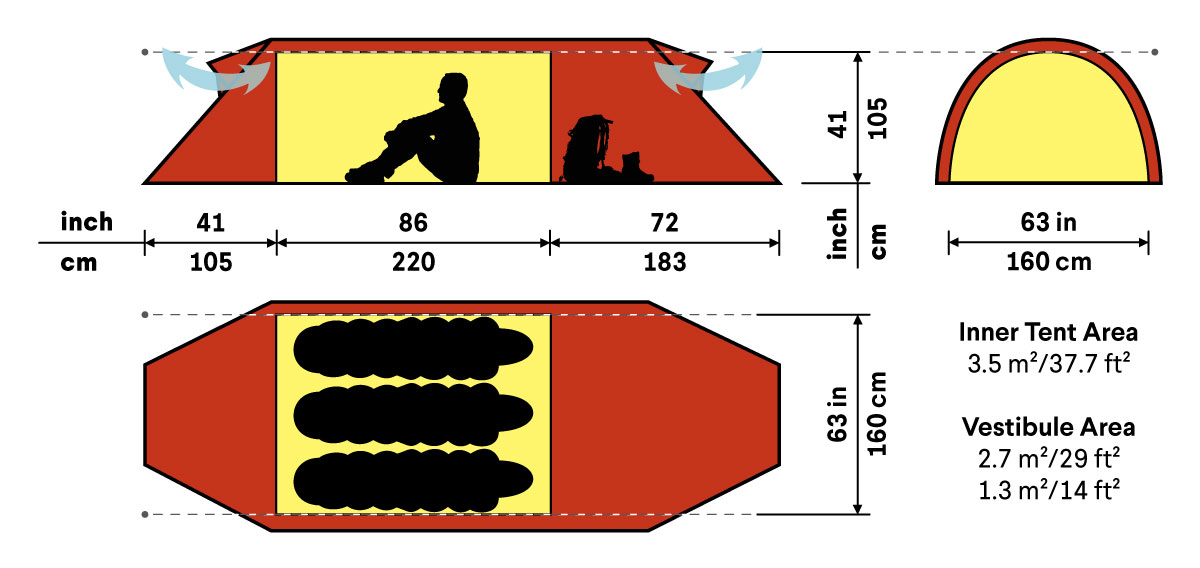 三人用隧道式四季營,提供特大營內空間。